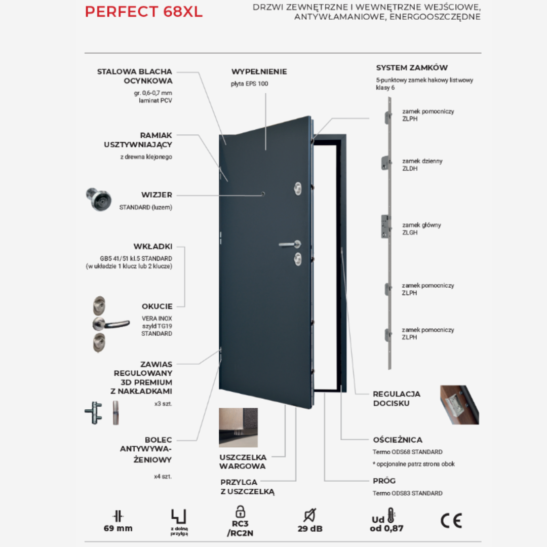 | "Drzwi zewnętrzne model Perfect 68XL antywłamaniowe, energooszczędne. Do kompletu drzwi wchodzi -Skrzydło -Ościeżnica ciepła ODS z progiem i uszczelką -Okucia BEZ DOPŁATY Okucia Premium w zestawie Klamka Vera Inox odporna na korozję, zadrapania, unikalny szlif powierzchni, ergonomiczna o nowoczesnym kształcie rękojeści Komplet wkładek w zestawie Wkłada delta atestowana klasy B Wkładka i gałko wkładka w systemie 1 klucza 5 kluczy w komplecie Skrzydło z ościeżnicą jako komplet Pokryte folią z filtrami UV, Ocieplone pianą XPS Trzy bolce anty-wyważeniowe Ościeżnica: Ościeżnica ciepła drewniano-stalowa z blachy ocynkowanej o grubości 1,2 mm, laminowana w kolorze skrzydła. |