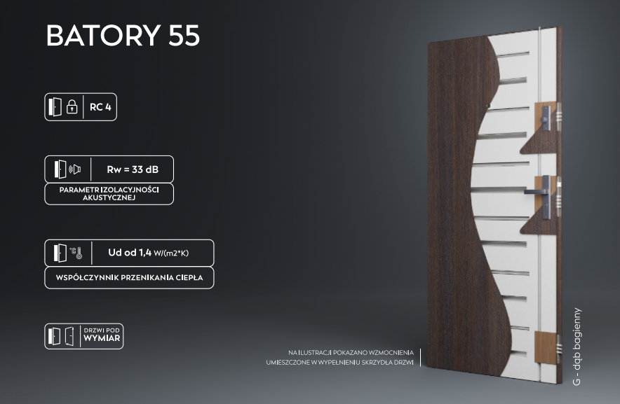 | "Drzwi zewnętrzne model BATORY 55mm antywłamaniowe. Do kompletu drzwi wchodzi -Skrzydło -Ościeżnica z progiem stalowym z uszczelką -Okucia BEZ DOPŁATY Okucia Premium w zestawie Klamka renomowanego producenta AXA odporna na korozję, zadrapania, unikalny szlif powierzchni, ergonomiczna o nowoczesnym kształcie rękojeści Komplet wkładek w zestawie Wkłada Wilka atestowana klasy B Wkładka i gałko wkładka w systemie 1 klucza 5 kluczy w komplecie Skrzydło z ościeżnicą jako komplet Pokryte folią drewnopodobną z filtrami UV, wypełnione polistyrenem spienionym [styropianem] Trzy bolce anty-wyważeniowe Ościeżnica: Ościeżnica stalowa z blachy ocynkowanej o grubości 1,5 mm, laminowana w kolorze skrzydła, wyposażona w uszczelkę akustyczną |