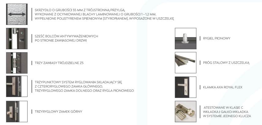 | Skrzydło o grubości 55 mm z trójstronną przylgą, wykonane z ocynkowanej blachy laminowanej o grubości 1 - 1,2 mm, wypełnione polistyrenem spienionym [styropianem], wyposażone w uszczelkę | |