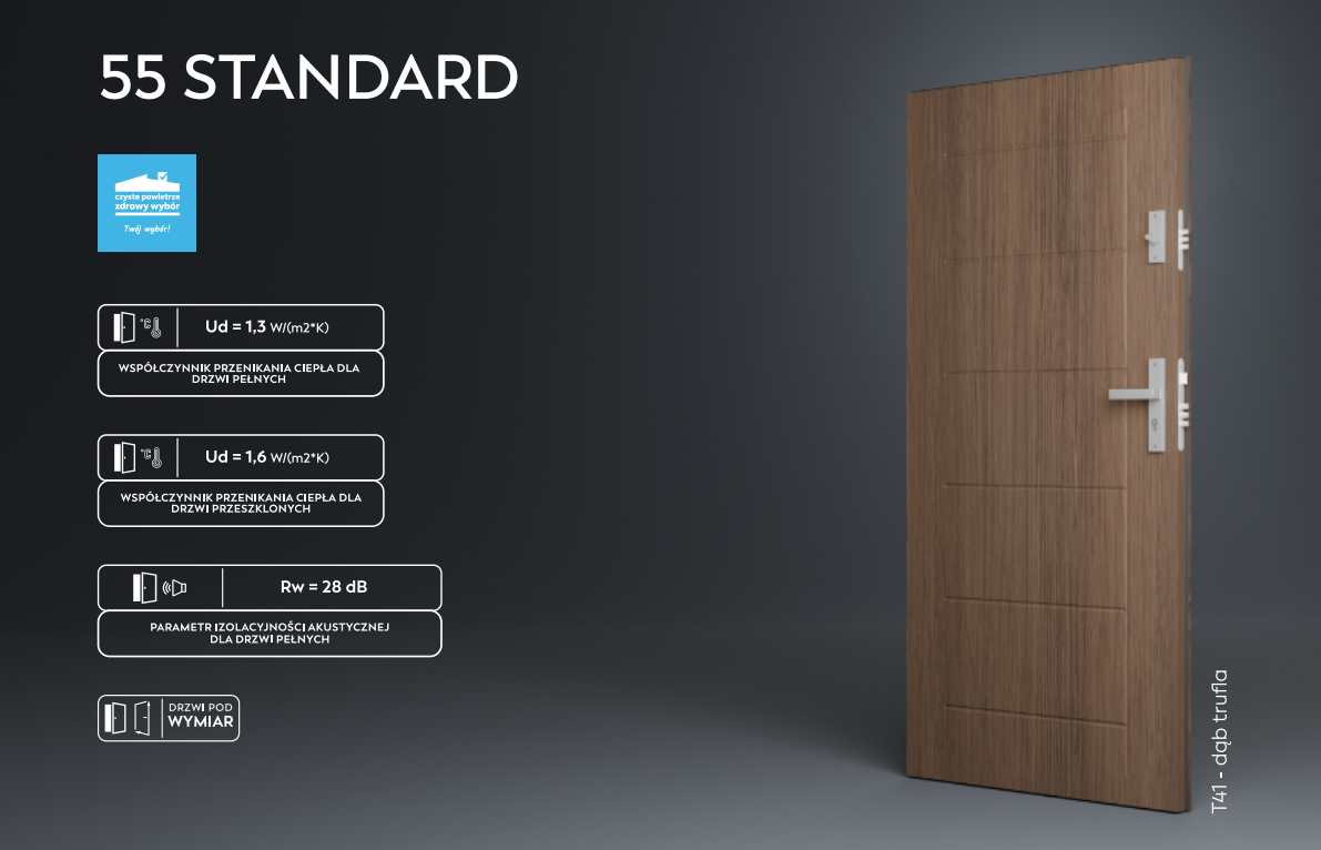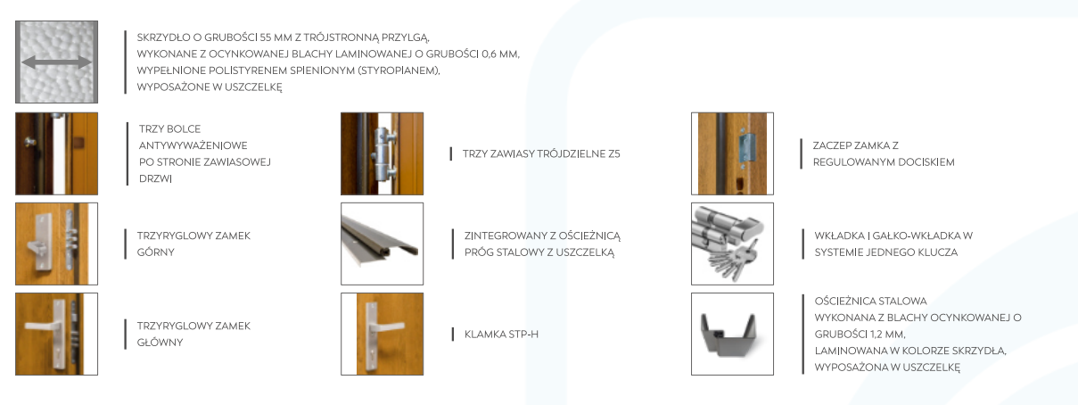 | Typ drzwi | 55mm Jednoskrzydłowe pełne z tłoczeniami |