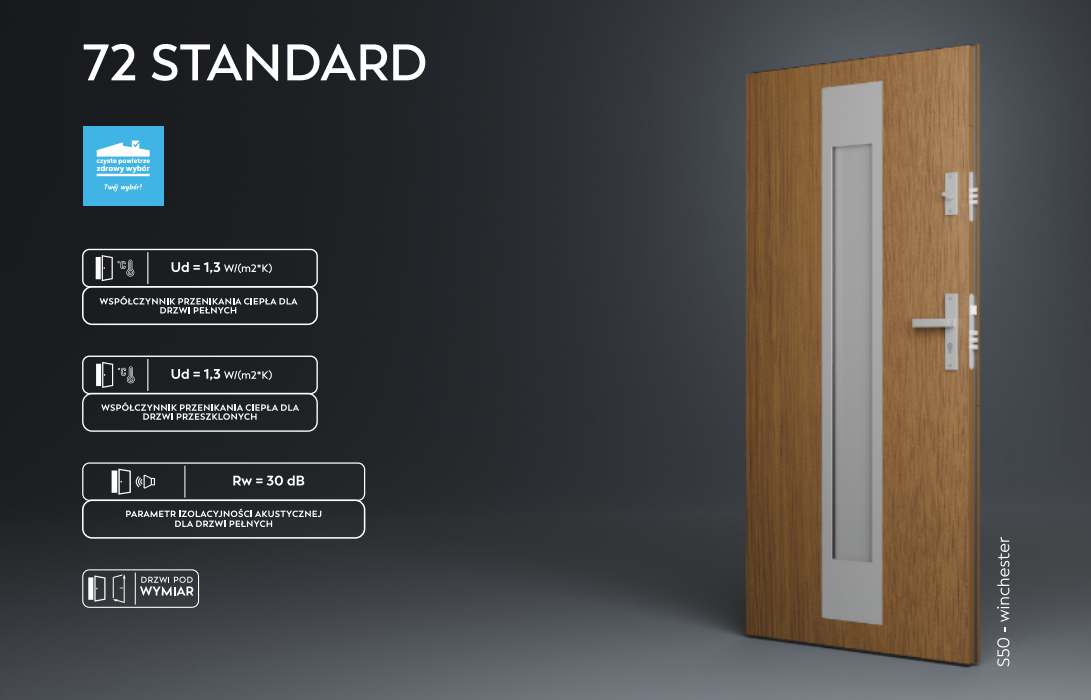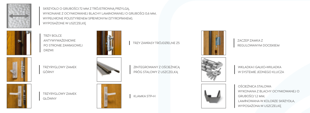 | Typ drzwi | 72mm Jednoskrzydłowe pełne z tłoczeniami |